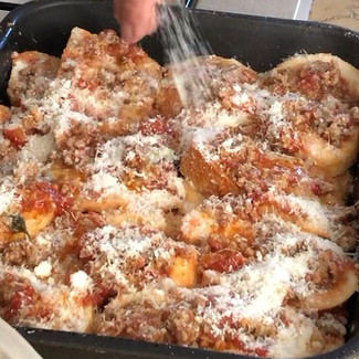 すりおろしたペコリーノチーズを乗せて再びパン、ミートソース、チーズ、、、