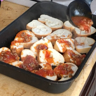 カットしてミートソースを敷いたオーブン皿に敷き詰め、上からもミートソースをかけ